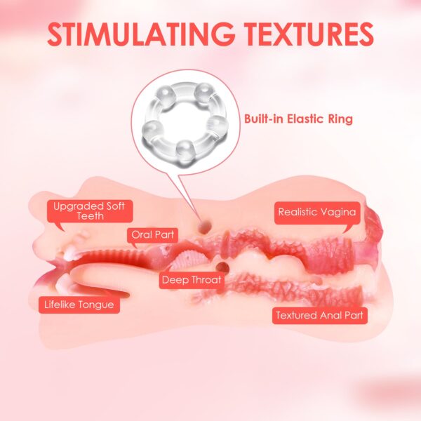 • Triple the enjoyment — With this male sex toy, you’ll never be faced with that frustrating debate over choosing an oral, anal, vaginal penetration experience as you have all three in one. Each orifice features many realistic internal features. The oral has teeth (not as sharp as the real deal) and a tongue, the vaginal has labia and even a clit, and the anal has rings of what-feel-like muscle.